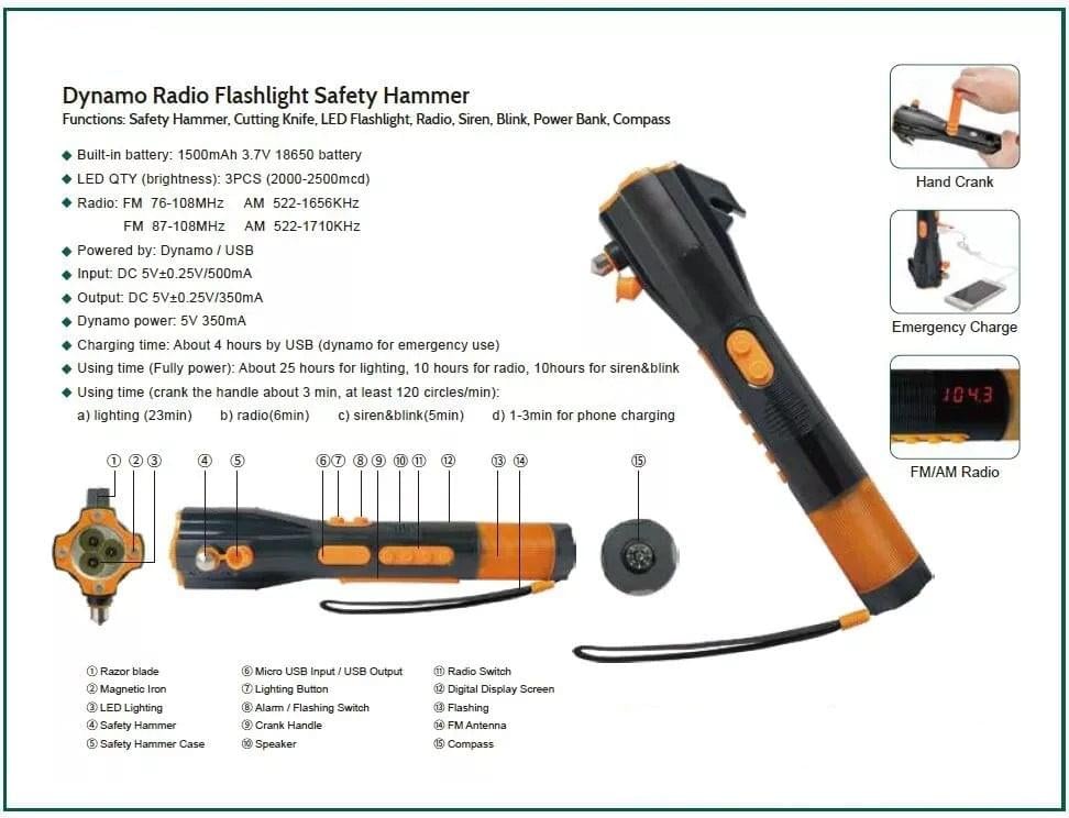 In an emergency, you can crank up enough power to run your flashlight for over 20 minutes. It will also get you 6 minutes of the flashing warning light.